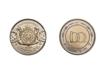 Az érme előlapján a Magyar Nemzeti Bank logója látható, amelyet az MNB 1924-ben kibocsátott részvényének díszítőkeretéből vett motívum vesz körbe – írja az Index. Az előlap szélső sávján a „Magyarország”, illetve a „100 éve a független, stabil pénzügyi rendszer őre” felirat olvasható. Szerepel még az érme ezen oldalán a Magyar Nemzeti Bank alapításának éve (1924), illetve az érme verésének éve (2024) is. Az érme másik oldala teljesen azonos a jelenleg is forgalomban levő százforintoséval.