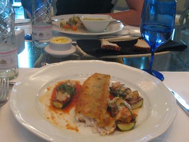 Az egyik főfogásunk a nap hala, ami aznap fogas, fűszeres bundában, töltött cukkinikkel, a másik pedig borjúragu petrezselymes rizottóval.