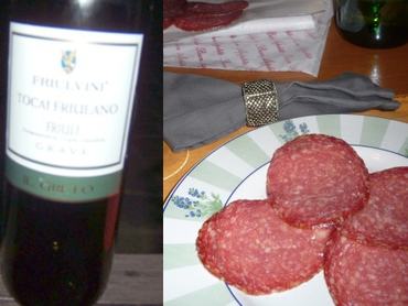 Fent a borosüveg mellett továbbá néhány szelet "salame ungherese" látható. Ezt az adagot egy teljesen hétköznapi külvárosi hentesnél vettem, és ízre a megtévesztésig hasonlít az igazi magyar téliszalámihoz. A különbség annyi, hogy ez a "magyar szalámi" sokkal vastagabb annál, amit itthon megszoktunk, általában szeletben árusítják a hentesek és nincs hozzá rendes kenyér. Olaszországban nem is szokás úgy kenyeret felvágottal fogyasztani, ahogy az nálunk egy hideg vacsora keretében rendszerint történik.