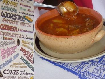 Az ár itt csak tíz euró volt, az adag azonban busás és a rossz előérzethez képest meglepően finom. Itt legalább eszébe jutott a szakácsnak egy kis paprikát beszerezni, mielőtt a gulyáskészítésnek nekifogott, és az eredmény annak ellenére kifejezetten élvezhetőre sikerült, hogy az állagot elég bizonytalanul valahol a gulyásleves és pörkölt sűrűsége közé félútra lőtték be. Még az sem rontott sokat az összképen, hogy az alapanyagok távolról sem voltak olyan jó minőségűek, mint Velencében.