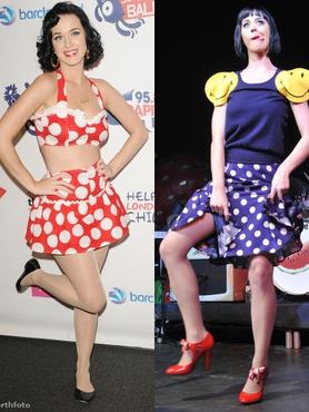 Katy Perryt nagyon sok mindenkihez lehet hasonlítani. Maga az énekesnő egyszer azt nyilatkozta, hogy ő olyan, mint Lily Allen, csak soványabb kiadásban. Eddigi elképesztően öltözködő celebjeink közül esetleg Dolly Partonhoz is hasonlíthatnánk ezt tipikusan amerikai giccsparádé-stílust, ami a humort úgy vegyíti ízléstelenséggel, hogy a végeredmény vagy ellenállhatatlan, vagy katasztrofális (nézőpont kérdése, hogy melyik). Sokan arra is rámutattak, hogy Dita von Teese és Katy Perry külsejében az az hasonlóság, hogy mindketten természetes szőkék, akik sötétre festik a hajukat.