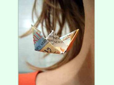 Nyina kishajó fülbevalója BKV-bérletből készült. Az alapanyag csak egy kis darab papír, nem tartós fém, vagy műanyag. Helyette ez a fülbevaló egy ritka aranyos vicc, kedves fricska, amire talán a kedves költő nem is gondolt hajtogatás közben.