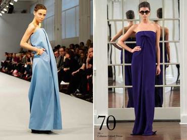 Victoria Beckham állítólag tavaly kölcsönkérte a (képünk bal oldalán látható) ominózus ruhát, de végül úgy döntött, hogy nem vásárolja meg, és visszaadta. Nem sokkal később a saját alkotásai között egy majdnem ugyanolyan ruhával jelentkezett (amit képünk jobboldalán lát).