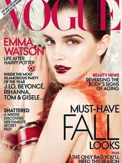 A 21 éves Emma Watson műanyag, flitteres Pradában és iszonyatosan csillogó rúzsban pózol a júliusi, amerikai Vogue címlapján. A belső fotókon szintén csillogó, köves ruhában és harisnyában enyeleg szmokingos férfiakkal, kislányos mosollyal az arcán.