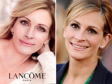 Az egyik problémás reklámfotón Julia Roberts látható. A színésznővel a Lancôme Teint Miracle alapozóját kívánta népszerűsíteni a cég. Állításuk szerint tíz év kutatás és fejlesztés eredményeként hozták létre azt a terméket, amely tökéletes bőrt varázsol használójának. A Daily Mail információi szerint Julia Roberts 15 millió fontot kapott azért, hogy ő legyen a L’Oréal almárkájának reklámarca. A vállalat azzal védekezett, hogy valóban végeztek utómunkálatokat, de a fotó tökéletesen visszaadja azt, hogy milyen természetesen egészséges és ragyogó bőre is van a színésznőnek.