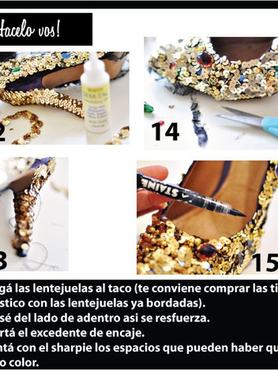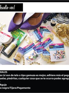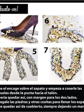 Tehát először összeszedi az ember a hozzávalókat: egy szép formájú, nem sajnált cipő, csipke, midnenféle flitterek, gyöngyök, fényes lapocskák aranyban és színesben. Ezeket hobbiboltokban, rövidárú üzletben szerezhetjük be, de a neten is keresgélhetünk a hozzávalók után. Kell még ragasztó, tű, olló. Ha eléggé belejövünk a kreatívkodásba, egy idő után az alapvető hozzávalókból és eszközökből mindig lesz elég otthon, mi például most egy festékszórót kértünk a szülinapunkra.