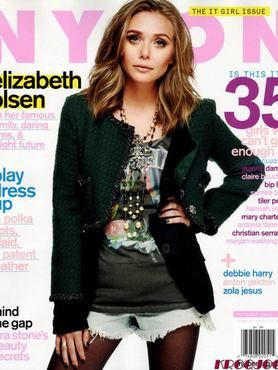 A Nylon címlapján Elizabeth Olsen farmersortot visel, fekete harisnyával, színes mintás pólóval és Kate Middletone-os fekete kiskabátkával. Az Olsen-ikrek húga a Sundance Filmfesztiválon bemutatott Martha Macey May Marlene című filmben kapott szerepet, a tinik kedvence, Zac Efron (High School Musical) mellett. Állítólag jó eséllyel pályázik az Oscar-díjra.