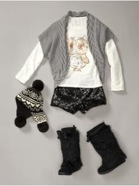 Az online katalógusban a Sequins are a Hoot! néven futó szett egy baglyos pólóból, szürke kardigánból, norvégmintás füles sapkából és egy mamutcsizmából áll, amihez ha egy harisnya-szoknya kombót vagy egy bélelt nadrágot passzint a stylist, egy aranyos kiscsajos outfitet kapnánk. De nem ez volt a cél.