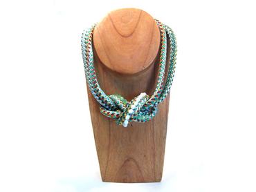 A 67 USD-ért, vagyis kb. 14700 Ft-ért megvásárolható ékszert divatos pasztellszínekben pompázó mászókötélből csomózta a tervező és színben passzoló kövekkel varrta ki.