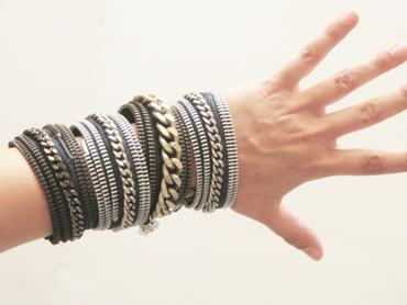 A maslindán ehhez hasonló, frappáns darabokat lehet találni, mint például ezek a legújabb divatnak megfelelően felhalmozott húzózáras karkötők.: