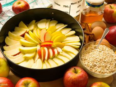 A tésztát gyors mozdulatokkal összegyúrjuk, fél órára behűtjük. Kerek piteforma aljára lapogatjuk, illusztrációnkkal ellentétben legyen egy kis pereme. Rá a vékony szeletekre vágott alma. Be a 200 fokos sütőbe, amikor a széle pirulni kezd, rá az összekevert szósz. Addig kell sütni, amíg nagyon pirulni nem kezd, nagyjából 15 perc. Szezonban érett szilvából még finomabb.