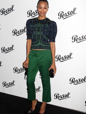 A dominikai származású amerikai színésznő, Zoe Saldana nagy szenzációt keltett New Yorkban zöld nadrágjával, amihez a színpalettán igencsak közel álló türkizkék és limezöld színekben pompázó felsőrészt választott. Az összhatás nem lett rossz, de ügyelni kell arra, hogy ne keverjük túl sokat az árnyalatokat, mert könnyen átmehet az aznapi outfit nevetségesbe.