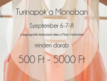 A szélsebesen beköszöntött őszi hangulatot sokak számára vidámabbá varázsolja az évente kétszer turinapot tartó Mono Fashion, ugyanis belvárosi üzletükben szeptember hatodika és nyolcadika között minden magyar designer által tervezett darab szinte jelképes áron, 500 és 5000 forint között kaparintható meg. A fillérekért beszerezhető sikkes darabok többek között Nanushka, Miju, Artista, Je Suis Belle, Use temporary-ra bővülő USE, a Tanktheory és Nagy Adrienn kollekciójából származnak. Továbbá a kifinomult stílusáról ismert Nubu gyűjteménye is megtalálható az üzletben - a magyar márka múlthéten Bécsben a Summer of Fashion rendezvényen nagy sikerrel mutatta be 2012-es őszi-téli kollekcióját az osztrák közönségnek.