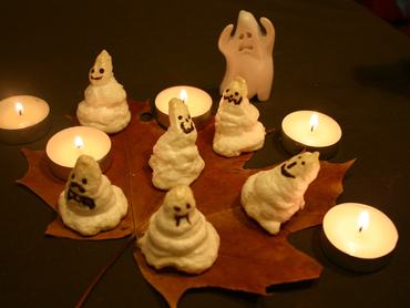 A habcsókokat tegye előmelegített sütőbe (80-100 fokon), és szárítsa legalább két órán át. A sütőből kivéve hagyja kihűlni, majd vízgőz felett olvasztott csokoládéval rajzolja meg a szellem arcát.