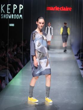 A Kepp Showroom bohókás, fiatalos ruhákat vonultatott fel. A nyomott mintás selyemruha a képen például ideláis választás egy szaladgálós napra, amikor mégiscsak normálisan kell kinézni, a galériában látható, sárga inge, szürke szoknyás szett pedig bármelyik munkanapot feldobhatja.