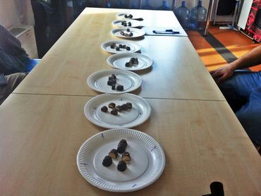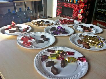 Marcipános szaloncukrokat kóstoltunk, aztán a vakteszt után, ahogy ez már lenni szokott, megnéztük, melyiknek mennyi a fajlagos ára. Az első olyan termékteszt volt, ahol nem kellett könyörögni a kollégáknak, hogy szálljanak be a kóstolásba. Így történt, hogy kilencen gyűltünk össze a szerkesztőség konyhájában, hogy teletömjük magunkat a marcipános édességekkel.