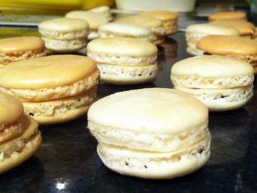 10. A teljes sütési idő nálam kb 15 perc szokott lenni. A nem színezett macaron elvileg arisztokratikusan sápadt, amit nem érünk el, ha csak a talpak kialakulása után csavarjuk lejjebb 120 fokra a hőmérsékletet. Ha valakit ez zavar, 7 perc környékén próbálkozhat Piszke módszerével, aki rájuk nyitja az ajtót, és a sütő felső részét egy sütőpapírral takarja el, hogy a tepsi alatt menjen be a hideg. Ettől a macaronok kicsit összébb fognak esni, de ideális esetben nem nagyon. Az én B tervem az, hogy a sütőbe tevés után rögtön leveszem a hőfokot 130 fokra, úgyis lassan hűl vissza, de nem nyitogatom, ezek itt a lentebbi képen a sápadtak.