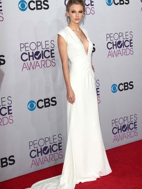 Taylor Swift az amerikai nép kedvenc country énekesnőjeként távozott az eseményről, melyen végig annak drukkolt mindenki, nehogy mellet villantson a mélyen dekoltált Ralph Lauren estélyiben. A földet söprő, fehér, mélyen dekoltált ruhával Swift a külföldi sajtó szerint remekül bizonyította, hogy jól van szakítása után (eddig volt pasija, Harry Styles, a One Direction énekese), és nagyon ügyesen megoldotta a stylist, hogy nehogy mell villanjon: valószínűleg kétoldalú ragasztóval rögzítette a ruhát Swift mellén. A türkiz kiegészítők és a füstös szemfestés is illett a görög istennős ruhához.