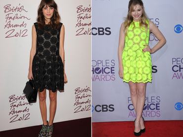 A brit Vogue 29 éves szerkesztője a tavaly novemberi British Fashion Awards tiszteletére vette fel a Simone Rocha által tervezett ruha fekete verzióját, míg Chloe Moretz a neonsárga változatot viselte a januárban megrendezett People's Choice Awards díjátadón, ahol nagy sikert aratott vele. Alexa Chung a virágmintás csipkeruhához különlegesebb lábbelit, egész pontosan Nocholas Kirkwood Belle Epoque névre keresztelt cipőjét viselte. A 15 éves Chloe Moretz azonban nem mert a neonsárga mellé további extrém kiegészítőket felvenni, így maradt a fekete cipőnél. Melyikük jobb?
