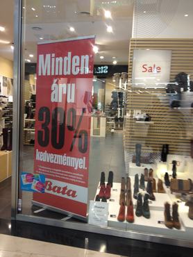 Annak ellenére egyébként, hogy a kirakatban „végső árak, -50%-ig” feliratú tábla díszeleg, a márkás csizmákból maximum 10-20% jön le, és a bőr körömcipők is csak 2 ezer forinttal olcsóbbak, mint korábban (13990 helyett 11990 forint az áruk).