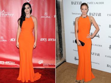 Emily Blunt nagy sikerrel viselte a ruhát még 2012 októberében, a Harpers Bazaar év nője választásán, a londoni Claridge's Hotelben. Perry nem vitt magával a vörös szőnyegre táskát, Blunt viszont igen, egy fekete McQueen clutch-ot, és míg Blunt felkötötte haját, Perry elegánsan oldalra fésülve leengedte. Blunt esetében egyébként akár tudatos választás is lehetett a narancs, mivel az év nője bulit épp október 31-én, Halloweenkor tartották, amikor minden narancsszínbe borul az angolszász területeken. Ez tulajdonképp a mi szempontunkból mindegy is, csak egy a lényeg: kinek áll jobban a McQueen ruha?