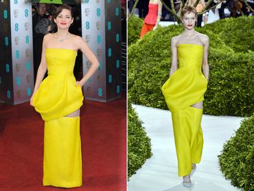 Marion Cotillard az Oscar gála előtt nem sokkal a Brit Filmakadémia díjátadóján járt: február 10-én a londoni esőben mosolyogva vonult be a vörös szőnyegen a gálára egy különlegesen szabott napsárga Dior estélyiben. A 2013-as tavaszi-nyári Dior Haute Couture ruha a Jennifer Lawrence-ről „leszakadó” ruhához nagyon hasonlít, de szerencsére ezen a darabon egyértelműen látszik, hogy tervezői bravúr a combközépnél tátongó, tüllel borított nyílás, nem egyszerű hiba. Hogy őszinték legyünk, szerintünk Cotillard-on még jobban áll a ruha, mint a modellen, mert dereka legalább olyan vékony, mint a Dior manökenjéé, Axente Vanessáé de van hozzá melle is.