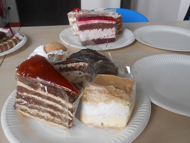 Dobos torta: Nagyon ízletes a csokikrém, és jól ropog a teteje. Hú, ez tök jó! Jó sötét és finom a csoki, a tésztája egy picit száraz. De azért tetszik! (Nyilván a kolléganőnek lehetett valami baja amikor ezeket a sorokat írta, mert nála nagyobb gasztronácit még sosem láttunk. És ez a torta ehetetlen volt, ezt a többi kóstoló is megerősítette.)/Messze elmarad az igazi dobos tortától, a teteje folyós (?), és nagyon ragad is./Elég bizalomgerjesztő kinézetre, és az illata is isteni. Viszont OMFG, ilyen sz..t még sosem ettem./A krém, és úgy az egész ehetetlen.