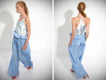 A tervező tavalyi kollekciójának legnagyobb slágere, ami az idei szezon egyik legnépszerűbb ruhadarabja, az overáll volt. A kollekcióit kézzel festő designer 2013-as tavaszi kollekciójánál is hű maradt önmagához és inkább színekben, mint szabásvonalakban gondolkodott. Az összeségében lenge, fiatalos, javarészt selyemből készült darabok közül a legmeglepőbb a farmer három árnyalatából – fakó azúr, éjék és indigó – készült denim kollekció, melynél kivételesen árakat is találtunk Tomcsányi Dóra oldalán. Egy kis galléros kék miniruha 50300 forintba, egy hasonló színű ingruha pedig 44400 forintba kerül a tervező oldalán.