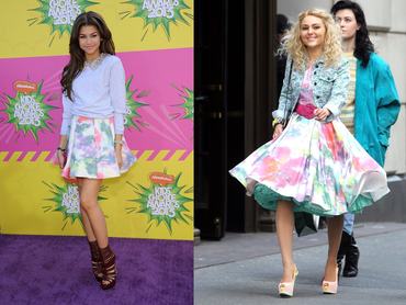 Zendaya Coleman mindössze 16 éves, de tinidívaként tündökölt ugyanebben a ruhában március 23-án, amikor a Kid’s Choice Awards-ra érkezett Los Angeles-ben. A hölgy a ruha felső részét egy világoskék pulóverrel takarta, egy visszafogott fülbevalón, egy órán és pár karkötőn kívül mást nem viselt. A barna lábbelije először meghökkentő, de minél tovább nézzük, annál jobban hozzászokunk. Önnek melyik változat tetszik jobban?