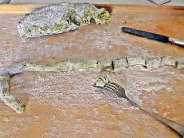 3. Az apróra vágott csalánt adjuk az összetört krumplihoz, és jól keverjük össze. Adjuk hozzá a két tojás sárgáját, ízlés szerint sót (2-3 csipet) és a lisztet, majd alaposan gyúrjuk össze. A tésztának puhának, de egybeállónak kell lennie. Ennél a pontnál bevethetjük a gyerekeket is, hiszen körülbelül egy cm-s átmérőjű kígyókat kell sodorni a kapott tésztából, amiket utána kisebb kockákra kell felvágni. Ha nagyon autentitusak akarunk lenni, a kapott nudlikat a villa ágain is átpörgethetjük, hogy esztétikusabb, bordázott gnocchit kapjunk.