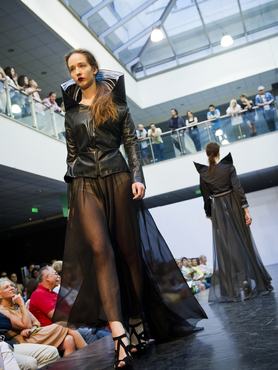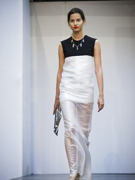Harmadikként a Mnemosyne márka alapítója, Strott Tímea következett. A fiatal tervező jelmezszerű ruháit egy fiktív világ, pontosabban egy alternatív múlton alapuló jelen istenségének készítette. "A kollekció inspirációja nemcsak a világban zajló eseményekre, és az emberiség pusztulásától, gazdasági illetve morális válságtól való félelemre reagál, hanem az intelligens textilek egyre nagyobb térhódítására, mindezt úgy, hogy szem előtt tartja a nemzetközi trendeket, és a science fiction toposzokat is" - áll a tájékoztatóban ez a szép körmondat. Ugyan nehezen tudjuk elképzelni, hogy Atargatisz ruhatárának darabjai sorra jönnének majd szembe velünk az utcán, de akarva, akaratlanul is eljátszottunk azzal a gondolattal, hogy a megfelelő sminkben és frizurával bizony szívesen pózolnánk bennük egy sort.