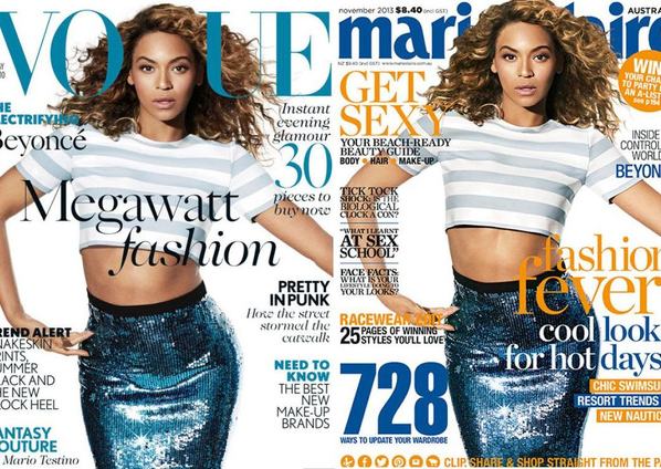 A brit Vogue és az ausztrál Marie Claire rukkolt elő tök ugyanolyan címlappal, fél év különbséggel: a májusi angol Vogue címlapján ugyanaz a fotó látható a csodálatos Beyoncéról, mint a novemberi ausztrál Marie Claire-en, és még a kékes betűszín se különbözik (Miranda Kerr is így járt nemrég).