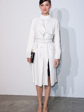 A tavasszal frizurát váltó színésznő nem fél kockáztatni, Carine Roitfeldhez hasonlón tisztában van azzal, hogyha egy jól szabott, elegáns kabátot vesz fel, egyáltalán nem fog senkit érdekelni, hogy mi van a ruha alatt. A 2014-es Dior Cruise bemutatóra galléros törtfehér kabátban érkező Cotillard egy neonzöld, lakkozott orrú cipővel tette még menőbbé szettjét.