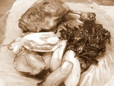 Párolt lilakáposztával, és a mellette sült almával, krumplival ettük.