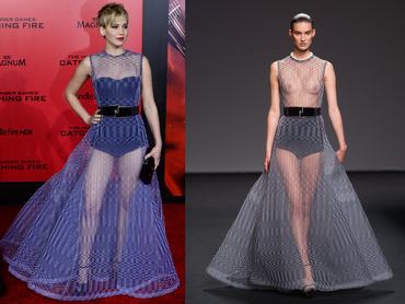 A színésznő a nyugati parti eseményre tartogatta a legmerészebb ruháját, ami ibolyalila színben pompázott. Lawrence-en konkrétan értékelhető ruhadarabként csak egy body volt, erre jött egy átlátszó felsőrész, ami alig takart, viszont ennek köszönhetően nem lett az alanyból Miley Cyrus. A kékes-lilás ruhához  fekete manikűr és pedikűr, ugyanilyen színű nyitott orrú magassarkú cipő és táska passzolt a híresség szerint. A smink füstös szemekre és bogyó színű ajkakra épült, az övet pedig szintén a kifutóról kölcsönözte a Futótűz sztárja.