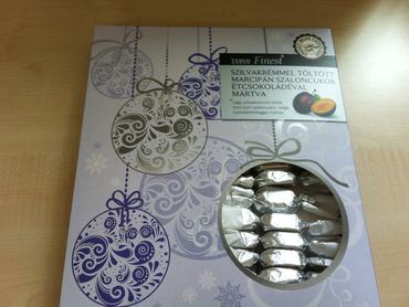 Az a gyanúnk, hogy ezek a saját márkás szaloncukrok mind egy gyártótól származnak, ugyanis a legtöbb csomagolása megegyezik. Sajnos az, hogy mi az összetételük csak itt a Sparosnál és Auchanosnál derült ki, mivel ezeknél volt csak feltüntetve az átlátszó csomagoláson. (Erről talál fotót a galériában.) Összetevők: fondan, kakaós étbevonó massza 20%, kakaópor 16%, növényi zsír, sovány tejpor, szójaliszt(??), zsírszegény kakaópor 3%, szójalecitin, tartósítószer. Attól függetlenül, hogy ilyen sok benne a kakaópor, ízre nem győzte meg a zsűrit.