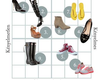 Infografikával szemléltetjük, hogy melyik fazonú cipő mennyire kényelmes és mekkora mértékű kockázattal kell számolnunk, ha hosszú távon viseljük.