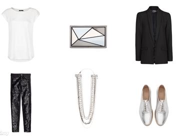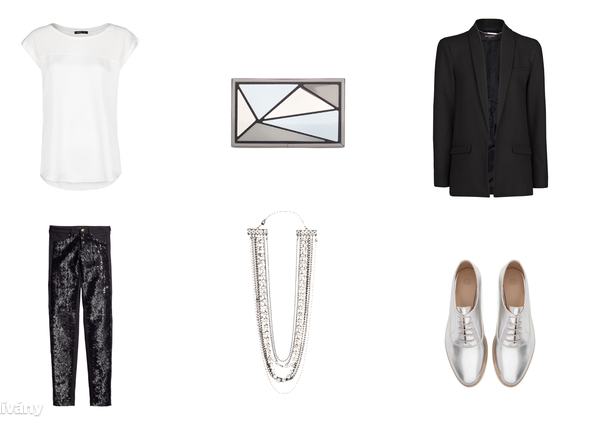 Mivel fehér blúz (vagy póló) és fekete zakó (vagy blézer) minden nő ruhatárában van, így ezt a szettet viszonylag könnyű összerakni. A flitteres alsórészhez sem feltétlenül kell ragaszkodni, de akkor lesz igazán vagány a megjelenése, ha a nadrág, esetleg a szoknya nem egy egyszerű, egyszínű darab, hanem van benne valami kis csavar.