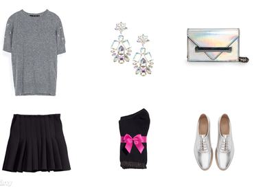 A képen látható összeállítást a karácsonyi ebédhez, a szilveszteri buliba is felveheti, de kisebb módosításokkal hétköznap is bátran hordható. A fázósabbak például egy jó vastag harisnyára is lecserélhetik a diáklányos zoknit.