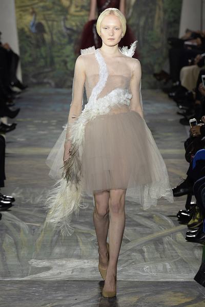 Az olasz divatház bemutatójának nyitódarabja egyébként egy átlátszó, hangjegyekkel díszített fehér estélyi volt, amit meglepő módon színben és anyagban is őszies beütésű darabok váltottak a kifutón. A keleties ihletésű, klasszikus fazont kapott kollekció a fehér, ezüst és vaníliasárga színek mellett javarészt a föld színeiből illetve állatmintás anyagokból készült.