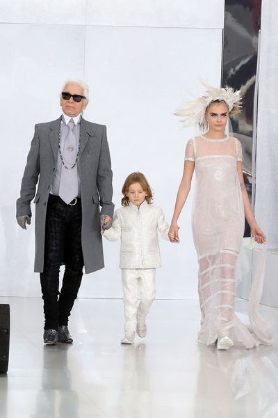 „Azt hiszem újra eljött az ideje annak, hogy a derékra helyezzük a hangsúlyt” – mondta a hasvillantó felsőkben és szögletes vállrészekben gazdag kollekcióról a tervező. A látványos bemutatót idén is a 21 éves, menyasszonyi ruhába bujtatott Cara Delevingne nyitotta és zárta, ezúttal Lagerfeld 5 éves keresztfiával kiegészülve.