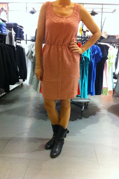 A Pull and Bearbe nagy elvárásokkal mentünk, de csalódtunk: míg farmerek, pulóverek, szoknyák és ingek nagy választékban kaphatók, ruhából hiány van. Ez a csíkos itt alább legalább nagyon olcsó, de tényleg csak otthonkának alkalmas, vannak viszont igazán jól szabott, igényes anyagú, növénymintás ruhák is. Külön pozitív, hogy nem csak modellen mutatnak jól, legalábbis az az egy, amit felpróbáltunk, jól állt – csak az volt benne nyomasztó, hogy 36-os mérete L-est kellett vásárolni, valamint az is, hogy hasnál volt egy kicsi lyuk a ruhán. Direkt. A lyuk nélküli változatot sajnos csak a márka honlapján találtuk meg, pedig az olcsóbb is, nézze meg a galériában!