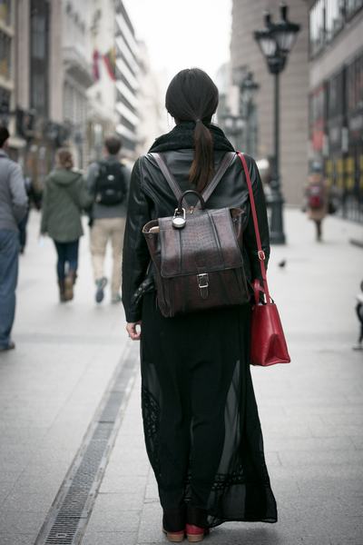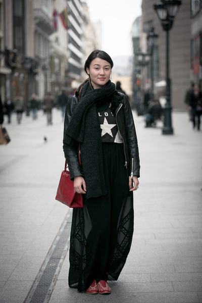 Ono hosszú ruhája a legújabb trendeknek megfelelően áttetsző, nagyon illik hozzá a biker-bőrdzseki és a szegecselt, kicsit veszkós hangulatú csizma. A cipő színe harmonizál az oldaltáska pirosával, és az egész szett nagyon egyben van. Kedvencünk a gondosan kidolgozott kézműves hátizsák, melyről iránytű fityeg – Ono ebben az összeállításban akár a New York-i divathétre is elindulhatott volna szerintünk. És ön szerint?