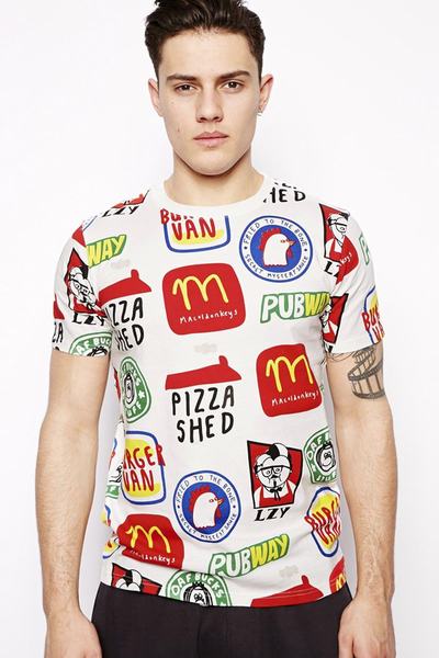 Úgy tűnik, a tervezők mostanában nagyon rákattantak a gyorséttermekre, hiszen nemrég Jeremy Scott készített egy ilyen kollekciót a Moschinónak, most pedig az ASOS-on fedeztük fel ezt a pólót. 53 euróért, tehát közel 17 ezer forintért az öné (vagy pasijáé) lehet ez a többek között Pizza Shed és Macoldonkey's feliratú felső.