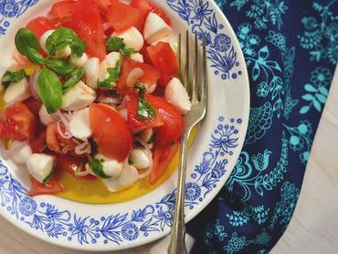 - A felaprított paradicsomot, a vékonyra vágott hagymát, az összetépkedett bazsalikomot és a felezett mini mozzarellákat (vagy kockákra vágott nagyot) összekeverjük, megsózzuk, löttyintünk rá egy kis olívaolajat. A sajt levéből 1-2 evőkanálnyival lazíthatjuk. Ha van otthon, és kedvünkre való, néhány csepp balzsamecet sem árt neki.