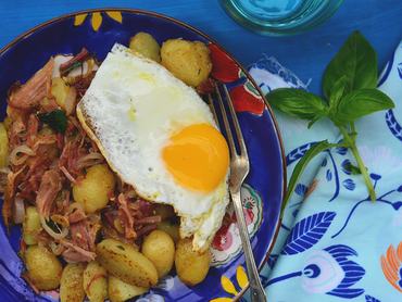 Izmosan: meleg krumplisaláta főtt sonkával és tükörtojással