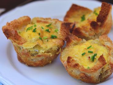 - A kenyér szélét levágjuk, a szeleteket sodrófával vékonyra nyújtjuk, vastagon megvajazzuk mindkét oldalát. Kibéleljük a kenyérrel muffinformát.