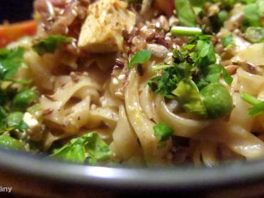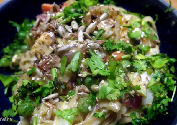 6. Itt az idő, hogy megkoronázzuk az ételt a szósszal – nekem ez a kedvenc részem, imádom, ahogy sistereg, mikor a kitikkadt zöldségekre borítom a mogyorós mázat. Újabb két perc kevergetés után készen is van –  korianderzölddel alaposan megszórva, a citrom másik felét ráfacsarva, pirított magvakkal megszórva tálalom, és rendkívül autentikus módon evőpálcikával fogyasztom. Nem azért, mert így menő, hanem mert így egy kicsit tovább tart.