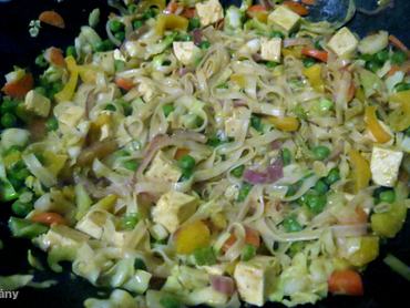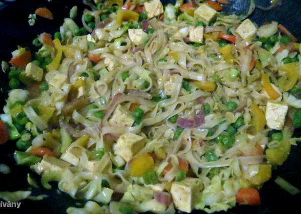 Az alap lehet rizs, vagy tészta, extraként pedig kerülhet bele tofu, vagy szeitán, azaz búzafehérje is – ez utóbbit előre ízesített, vagy natur formában, bio boltokban keresse, nagyon egészséges fehérjeforrás, és bármilyen klasszikus receptben kiváltható vele a hús.