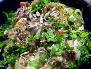 1. A tésztát a használati utasítás szerint készítem el – ez fajtánként változhat, de rendszerint percek alapp megfő, sőt, olyan is van, amit egyáltalán nem kell főzni, csak forró vízbe áztatni tíz percre. A kész tésztát leszűröm, és kicsit félrerakom.